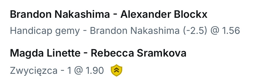 Dzisiejsza oferta tenisowa daje ciekawą okazję do połączenia dwóch solidnych typów. W pierwszym stawiamy na doświadczoną Magdę Linette, która na twardych kortach czuje się jak w domu. W drugim – na pewne zwycięstwo Brandona Nakashimy z handicapem gemowym przeciw debiutującemu na tym poziomie Alexanderowi Blockxowi.